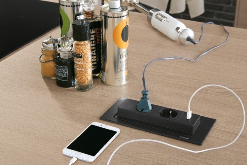 Las encimeras de cocinas èggo permiten ocultar enchufes mediante accesorios retráctiles. Así, nadie se llevará un calambre inesperado por meter los dedos donde no debe.