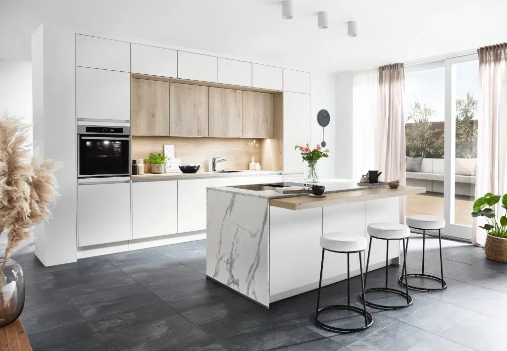 Los muebles estrechos, verticales, de colores claros como blanco o beige, sin tiradores visibles o con frentes lisos son ideales. Las vitrinas con cristal también ayudan a aportar ligereza. Si estás buscando inspiración, puedes explorar nuestras propuestas de cocinas pequeñas y modelos adaptados a espacios reducidos.