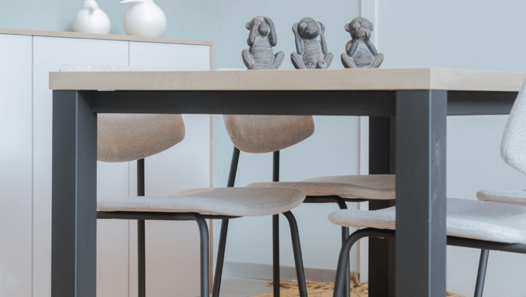 Las mesas cuadradas encajan bien en cocinas pequeñas o distribuciones simétricas, creando un ambiente equilibrado y funcional.