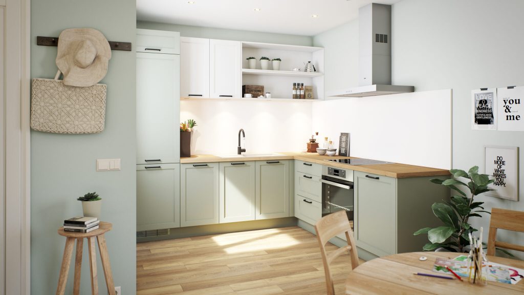 Los tonos naturales como el azul fjord, el verde mineral, el jade o el arena combinan muy bien con cocinas de acabado madera, por ejemplo, si buscas un estilo más campestre.